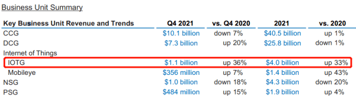 在晶圓代工巨頭臺(tái)積電公布的財(cái)報(bào)中,2021年其手機(jī)業(yè)務(wù)營收首次被HPC(大型高性能計(jì)算)業(yè)務(wù)超越,面向汽車板塊的營收和訂單需求也猛增。 圖像傳感器芯片設(shè)計(jì)龍頭韋爾股份最新財(cái)報(bào)顯示,其半導(dǎo)體業(yè)務(wù)收入同比增長18%,雖然智能手機(jī)CMOS占據(jù)營收大頭,但業(yè)績?cè)鲩L主要來源于車載CIS與安防CIS,尤其在安防領(lǐng)域?qū)崿F(xiàn)高達(dá)60%的業(yè)績?cè)鲩L。 2021年物聯(lián)網(wǎng)事業(yè)部(IoTG)成為國際半導(dǎo)體巨頭英特爾增長最快的業(yè)務(wù),同比增長33%,同時(shí)汽車自動(dòng)駕駛業(yè)務(wù)也增速驚人,反觀主營PC終端的CCG部門業(yè)績僅增1個(gè)百分點(diǎn)。