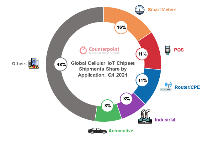 在蜂窩物聯(lián)網(wǎng)芯片中,當(dāng)前應(yīng)用規(guī)模最大的是低速率的NB-IoT芯片(占比60%),NB-IoT也是我國主推的物聯(lián)網(wǎng)連接方式,應(yīng)用在智能儀器表盤、資產(chǎn)追蹤等場(chǎng)景。其次是中速率的2G/3G(占比30%),用于移動(dòng)支付、智能穿戴和智能家居中。4G Cat.1和5G大約占比10%, 5G模組的成本過高,加上大部分物聯(lián)網(wǎng)終端對(duì)傳輸速率的需求性不高,5G在物聯(lián)網(wǎng)終端的應(yīng)用占比較低,主要是自動(dòng)駕駛和視頻監(jiān)控領(lǐng)域,但隨著2G/3G轉(zhuǎn)網(wǎng),Cat.1在智能支付、定位追蹤、車載終端、視頻監(jiān)控領(lǐng)域的高速增長,正逐漸打破蜂窩物聯(lián)網(wǎng)6:3:1的格局。從應(yīng)用場(chǎng)景來看,智能表計(jì)、POS支付、路由器/CPE、工業(yè)、汽車是蜂窩物聯(lián)網(wǎng)芯片應(yīng)用最廣泛的前五大場(chǎng)景。